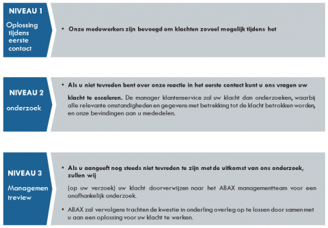 Als u niet tevreden bent met de uitkomst van het overlegproces van ABAX zullen wij uw klacht escaleren naar het management van ABAX ter nadere beoordeling en behandeling.
